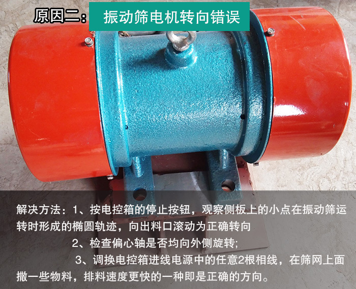 3、調(diào)換電控箱進(jìn)線電源中的任意2根相線,在篩網(wǎng)上面撒一些物料,排料速度更快的一種即是正確的方向。